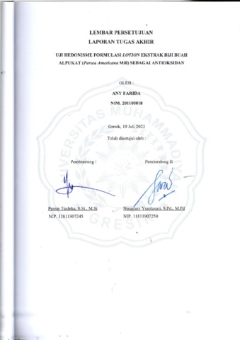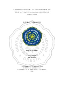 Farida, Any (2023) Uji Hedonisme Formulasi Lotion Ekstrak Biji Buah Alpukat (Persea Americana Mill) Sebagai Antioksidan. Diploma thesis, Universitas Muhammadiyah Gresik.