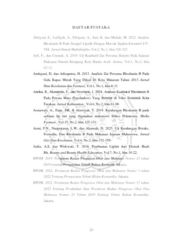 Lip tint merupakan produk kosmetik yang popular dengan keunggulan dapat memberikan warna pada bibir dan memiliki tekstur cair, mudah digunakan, serta dapat memberikan kesan gradasi. Komponen utama Lip tint adalah zat pewarna, salah satu contoh pewarna yang tidak diizinkan BPOM adalah Rhodamin B, yaitu pewarna sintesis yang dilarang penggunaannya dalam kosmetik, jika masuk ke tubuh dapat menyebabkan iritasi hingga kanker kulit karena Rhodamin B bersifat karsinogenik, pada bibir pewarna tersebut dapat membuat kulit bibir pecah pecah. Tujuan dilakukan penelitian ini adalah untuk mengetahui ada atau tidaknya zat pewarna Rhodamin B pada Lip tint yang beredar di Pasar Gresik. Metode penelitian ini adalah metode eksperimental menggunakan 3 sampel Lip tint dengan kriteria berwarna merah dan tidak memiliki izin edar BPOM. Identifikasi Rhodamin B dilakukan dengan uji kualitatif yaitu uji pewarnaan dengan menggunakan benang wol, uji pereaksi menggunakan reagen Rhodamin B KIT, dan uji kromatografi Lapis Tipis (KLT) dengan fase diam silica gel F254 dan kombinasi fase gerak etil asetat : etanol 70% : amonia dengan perbandingan (12,5 : 5 : 2,5) yang selanjutnya diamati dibawah sinar Ultraviolet. Hasil penelitian menunjukkan bahwa 3 sampel negatif mengandung Rhodamin B. Hal ini ditunjukkan pada Uji Pewarnaan yang ditandai dengan pelunturan warna sampel pada benang wol, pada Uji Rhodamin B Kit tidak ada perubahan warna menjadi ungu seperti larutan pembandingnya, dan pada Uji KLT ketiga sampel memiliki selisih nilai Rf > 0,2 sedangkan syarat yang memenuhi adalah selisih nilai Rf < 0,2