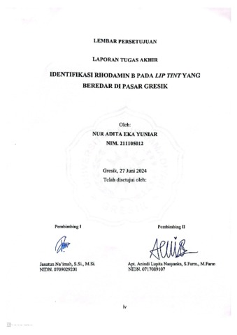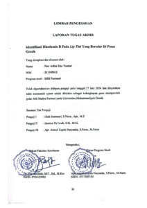 Yuniar, Nur Adita Eka (2024) Identifikasi Rhodamin B Pada Lip Tint Yang Beredar Di Pasar Gresik. Diploma thesis, Universitas Muhammadiyah Gresik.