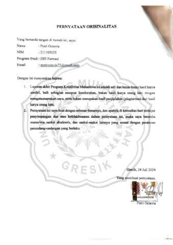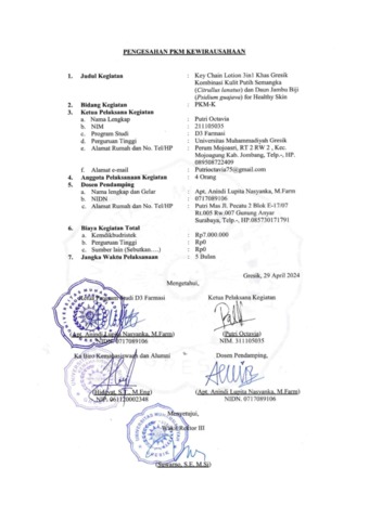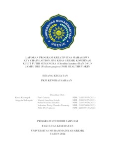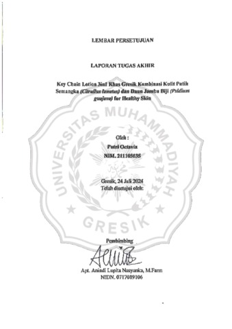 Octavia, Putri and Azizah, Viaristi Amelina and Salsabila, Ridani Faulika and Pramesty, Valentine Pretty Chandra (2024) Key Chain Lotion 3In1 Khas Gresik Kombinasi Kulit Putih Semangka (Citrullus Lanatus) Dan Daun Jambu Biji (Psidium Guajava) For Healthy Skin. Diploma thesis, Universitas Muhammadiyah Gresik.