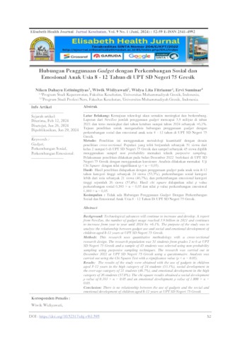 Estiningtiyas, Niken Dahayu (2024) Hubungan Penggunaan Gadget dengan Perkembangan Sosial dan Emosional Anak Usia 8 - 12 Tahun di UPT SD Negeri 75 Gresik. Elisabeth Health Journal: Jurnal Kesehatan, 9 (1). pp. 52-59. ISSN 2541-4992