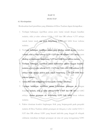 Uncontrolled Keywords: Malaria, kondisi lingkungan fisik, lantai rumah, dinding rumah, plafon, kawat kasa, genangan air