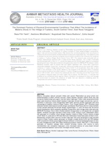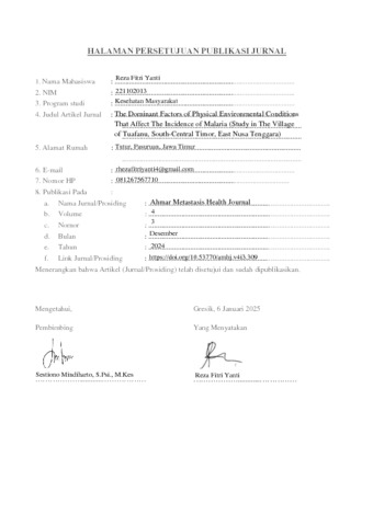 Yanti, Reza Fitri (2024) The Dominant Factors of Physical Environmental Conditions That Affect The Incidence of Malaria (Study in The Village of Tuafanu, South-Central Timor, East Nusa Tenggara). Ahmar Metastasis Health Journal, 4 (3). pp. 134-144. ISSN 2797-4952