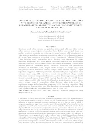 Setiawan, Danang (2025) Dominant Factors Influencing The Level Of Compliance With The Use Of Ppe (Among Construction Workers In Rehabilitation And Maintenance Of Community Health Center In Tuban District). Jurnal Kesehatan Kusuma Husada, 16 (1). pp. 73-83. ISSN 2087 –5002