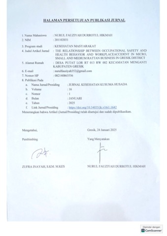 Hikmah, Nurul Fauziyah Durrotul (2025) The Relationship Between Occupational Safety And Health Behavior And Workplace Accidents In Micro, Small And Medium Rattan Businesses In Gresik District. JurnalKesehatanKusumaHusada, 16 (1). pp. 44-53. ISSN 2549 –371X