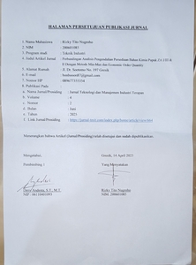Nugroho, Rizky Tito (2025) Perbandingan Analisis Pengendalian Persediaan Bahan Kimia Pupuk ZA I/III & II Dengan Metode Min-Max dan Economic Order Quantity. Jurnal Teknologi dan Manajemen Industri Terapan, 4 (2). pp. 331-339. ISSN 2829-0038