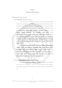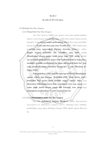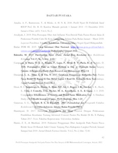 One Day Surgery (ODS) atau One Day Care (ODC) atau pelayanan rawat sehari merupakan pelayanan pasien untuk observasi, diagnosis, pengobatan, rehabilitasi medik, dan atau upaya pelayanan kesehatan lain yang memerlukan perawatan kurang dari 24 jam. Dalam mengurangi rasa nyeri pasca operasi ODS, diberikan terapi analgesik baik tunggal ataupun kombinasi. Analgesik adalah senyawa yang menekan fungsi susunan saraf pusat secara selektif dan digunakan untuk mengurangi rasa sakit tanpa mengurangi kesadaran. Kerasionalan peresepan analgesik oral sangatlah penting karena akan berdampak pada kepuasan pasien dan keberhasilan pelayanan ODS. Penelitian ini untuk mengetahui profil peresepan analgesik oral pada pasien ODS. Penelitian ini merupakan penelitian nonexperimental yang bersifat observasional dengan pengambilan data sekunder secara retrospektif terhadap lembar resep pasien menggunakan teknik total sampling. Pasien ODS tertinggi adalah pasien lanjut usia dengan asuransi BPJS, analgesik terbanyak yang resepkan adalah golongan NSAID yaitu asam mefenamat, jenis obat analgesik yang diresepkan adalah analgesik generik.