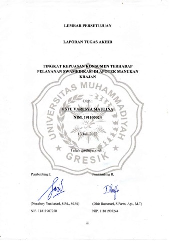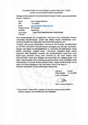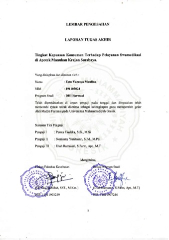 Maulina, Estu Varesya (2022) Tingkat Kepuasan Konsumen Terhadap Pelayanan Swamedikasi Di Apotek Manukan Krajan. Diploma thesis, Universitas Muhammadiyah Gresik.