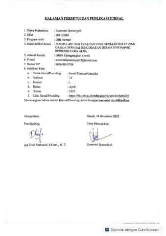 Qomariyah, Zumrotul (2023) Formulasi dan Evaluasi Fisik Sediaan Salep Zink oksida Sebagai Pengobatan Dermatitis Popok Berbasis Cera Alba. Jurnal Farmasi Galenika, 10 (1). pp. 56-64. ISSN 2579-4469