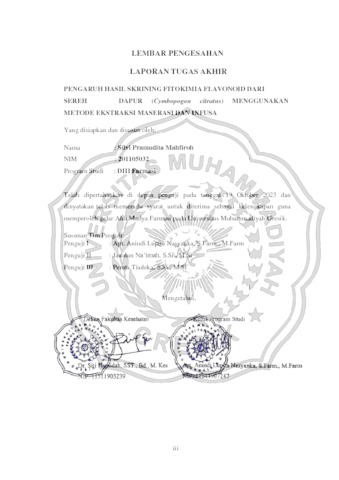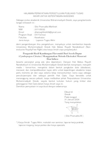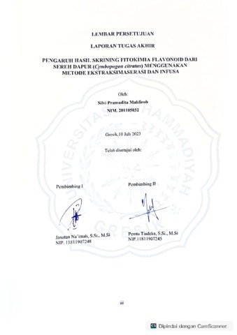 Mahfiroh, Silvi Pramudita (2023) Pengaruh Hasil Kandungan Flavonoid Dari Sereh Dapur (Cymbopogon Citratus) Menggunakan Metode Ekstraksi Maserasi Dan Infusa. Diploma thesis, Universitas Muhammadiyah Gresik.